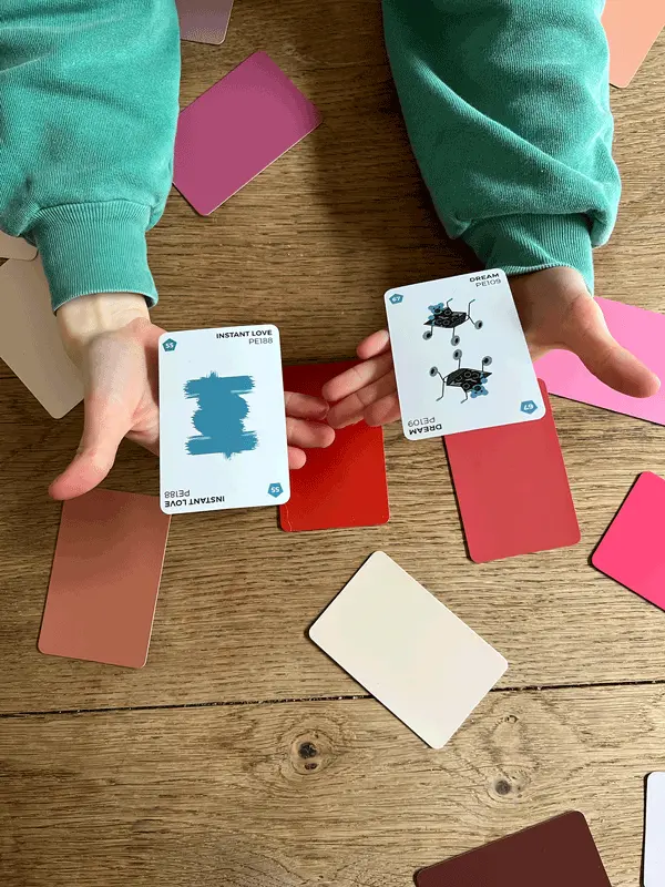Nous voulions concevoir un support couleur ultra-pratique et transportable grâce à des dimensions idéales. Nous avons alors décidé de joindre l’utile à l’agréable en créant un jeu de cartes sur les versos desquelles sont apposées nos 168 couleurs.